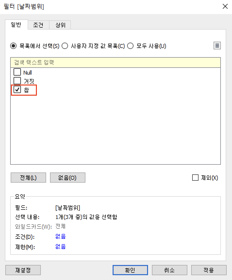 실제로 아래의 그림 16과 같이, 필터 선반에 있는 날짜 조회 필드('날짜범위')를 더블 클릭해 보시면 앞서 안 보이던 '거짓(False)'가 있죠. 조회하는 날짜 범위 밖에 있는 값이 '거짓'에 해당되어 필터링된 것입니다.