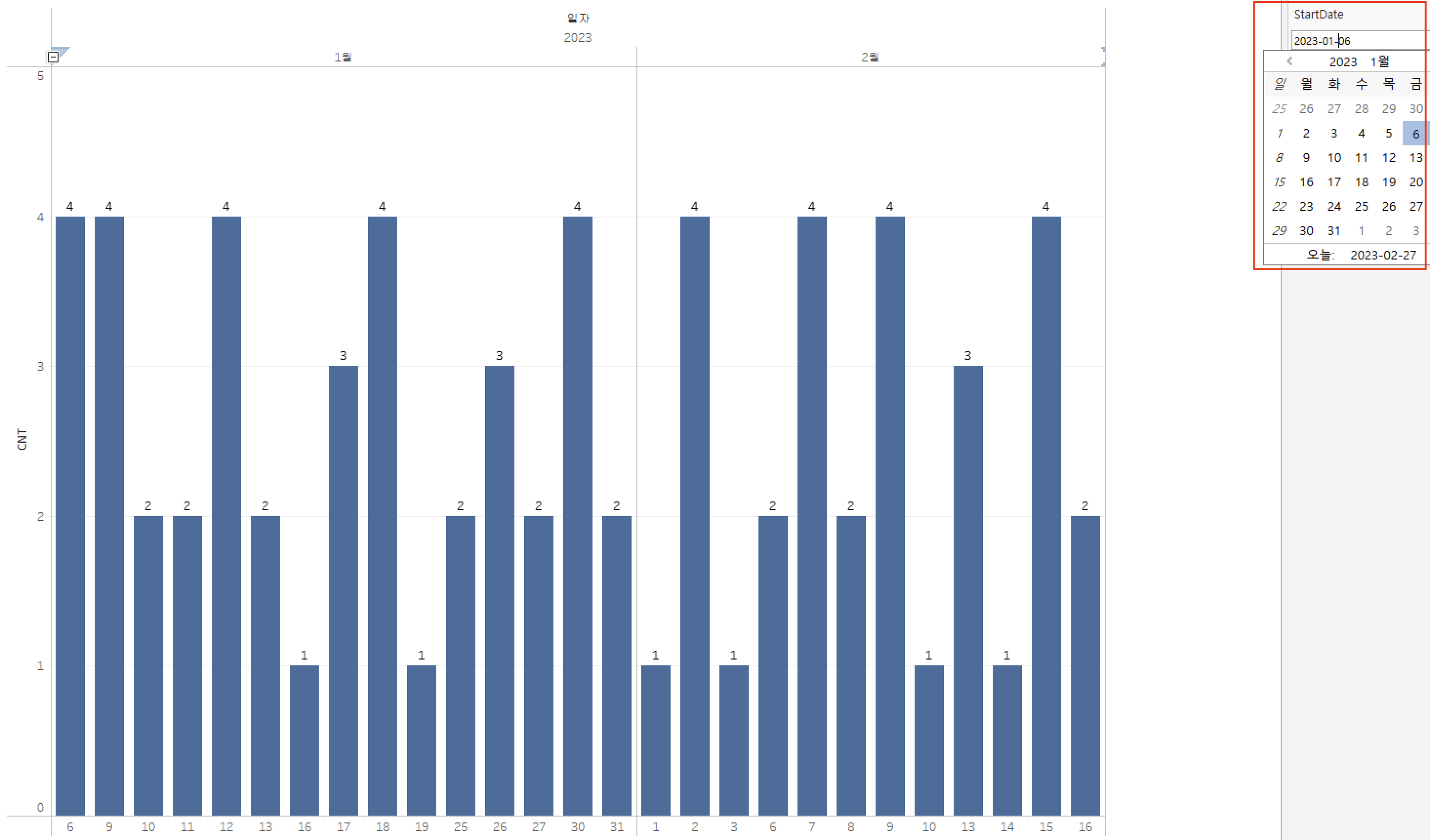 이제 실제로 입력하는 날짜에 따라 데이터가 조회되는지 테스트해봅니다. 아래의 그림 15와 같이, 조회 시작일을 1월 6일에서 1월 31일로 변경하자 해당 기간 내의 데이터만 표시되는 것을 확인하실 수 있습니다.