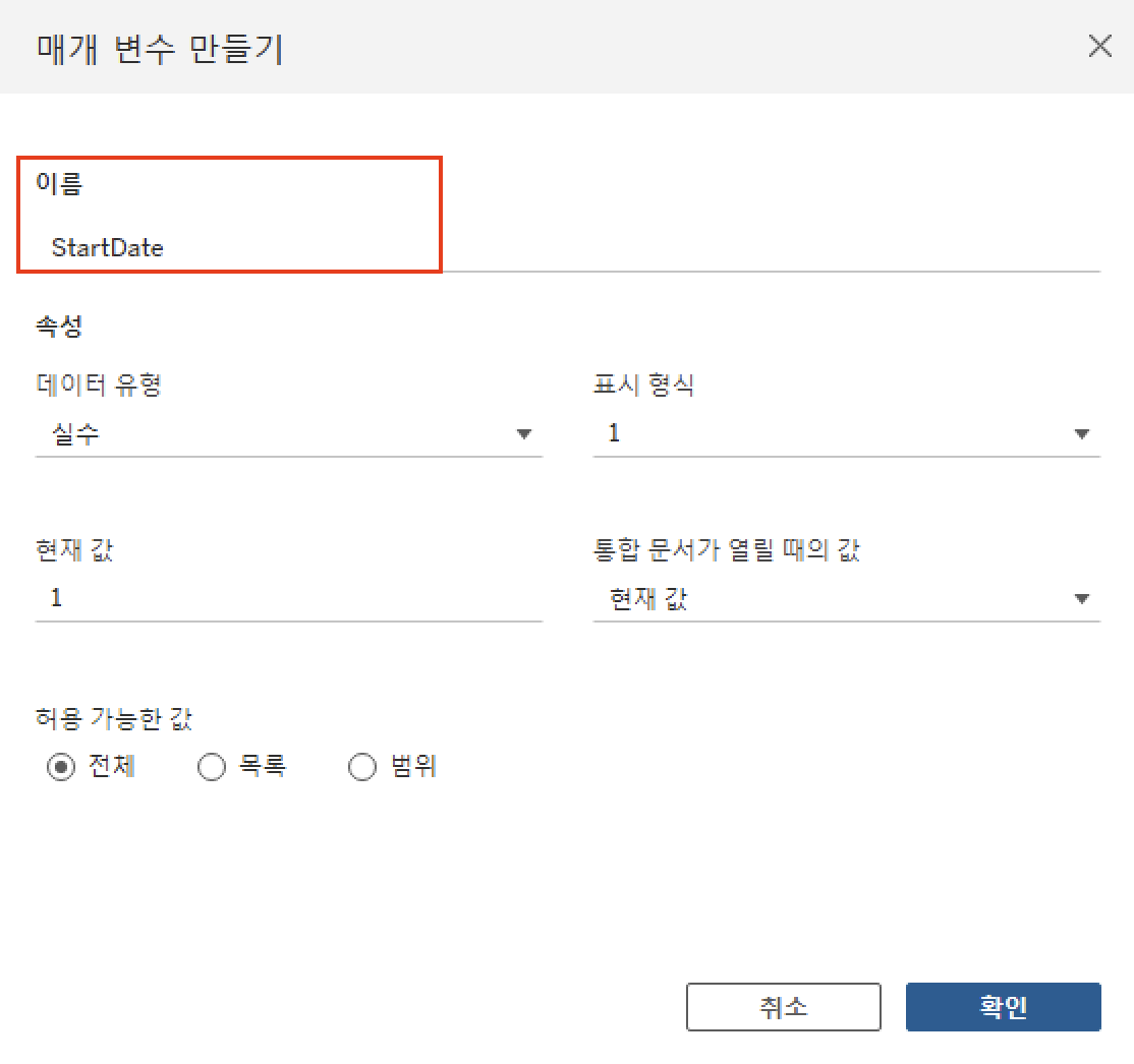 가장 먼저, 날짜 조회할 시작과 종료일 역할을 할 두 매개변수를 만들어 줍니다.