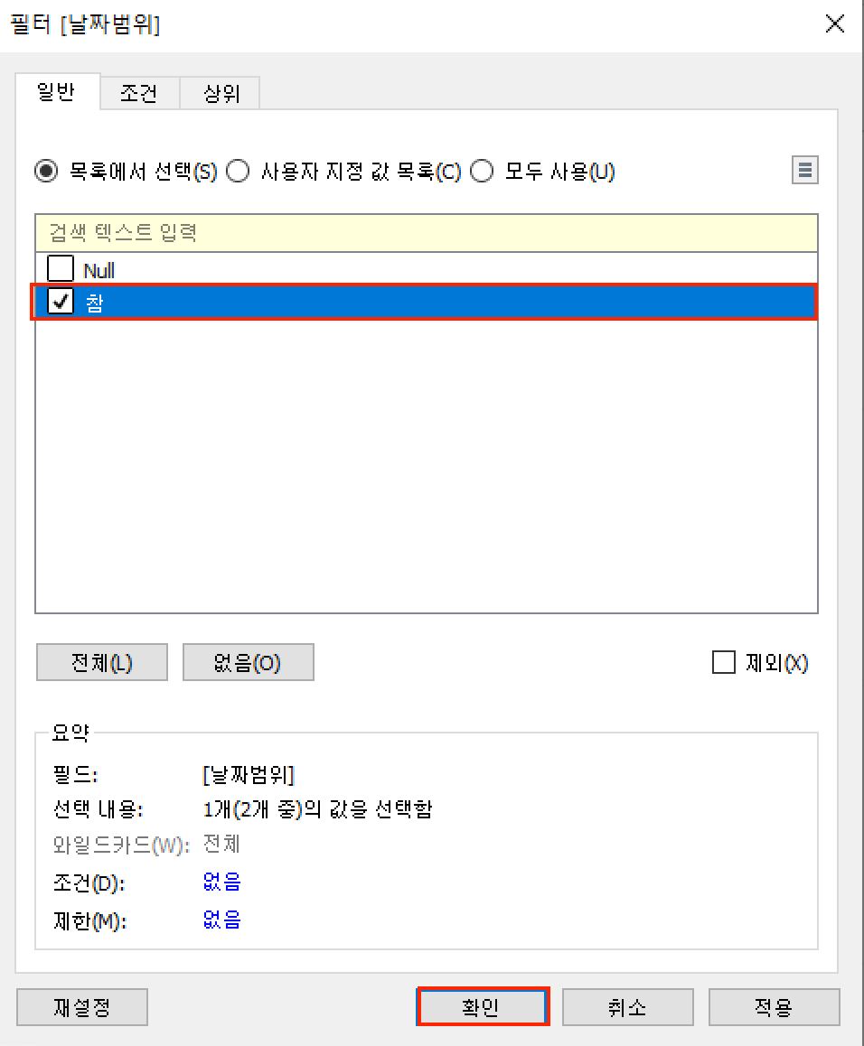 시작일~종료일 사이에 걸리는 데이터만 조회할 것이므로, '참'값만 체크하고 하단에 확인 버튼을 누릅니다 (그림 10).