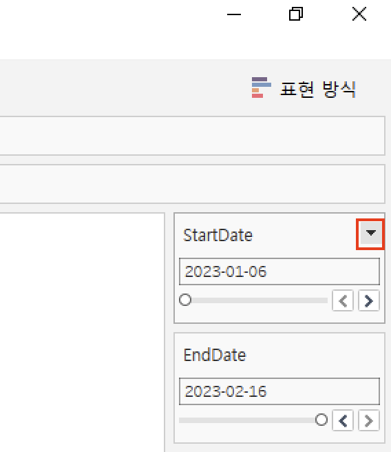 이제 아래의 그림 12와 같이 화면 우측 상단에 두 매개변수가 표시됩니다. 태블로에서 날짜 기반 매개변수 값 변경 방식의 기본값은 슬라이딩 방식입니다. 하지만, 날짜 조회는 보통 캘린더 형태의 UI가 보편적이죠. UI를 바꿔보겠습니다. 각 매개변수명 우측에 아래 삼각형 아이콘(▼)을 클릭합니다.