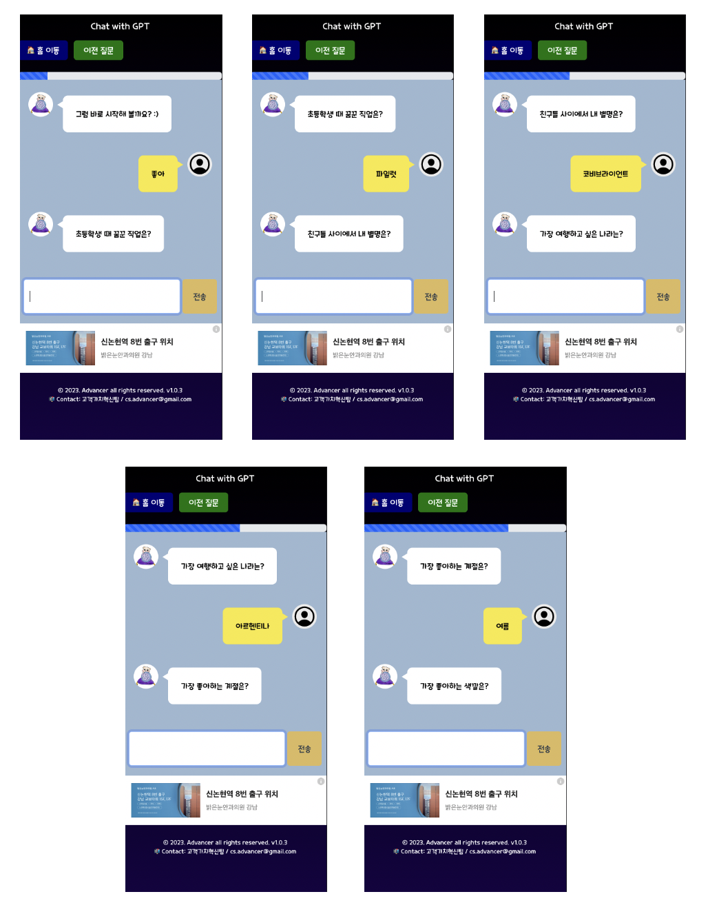 질문/답변 페이지는 위의 그림 5와 같이 총 5개의 질문으로(웰컴 메시지 1개 제외) 구성하였습니다. 사용자가 정말 전생 스토리를 알려줄 에이전트와 대화하는 듯한 경험을 제공하고자 카톡방 UI를 벤치마킹하였습니다. 텍스트 입력창에 자유롭게 답변을 입력하고 '전송' 버튼을 클릭하면 다음 질문으로 넘어갑니다.