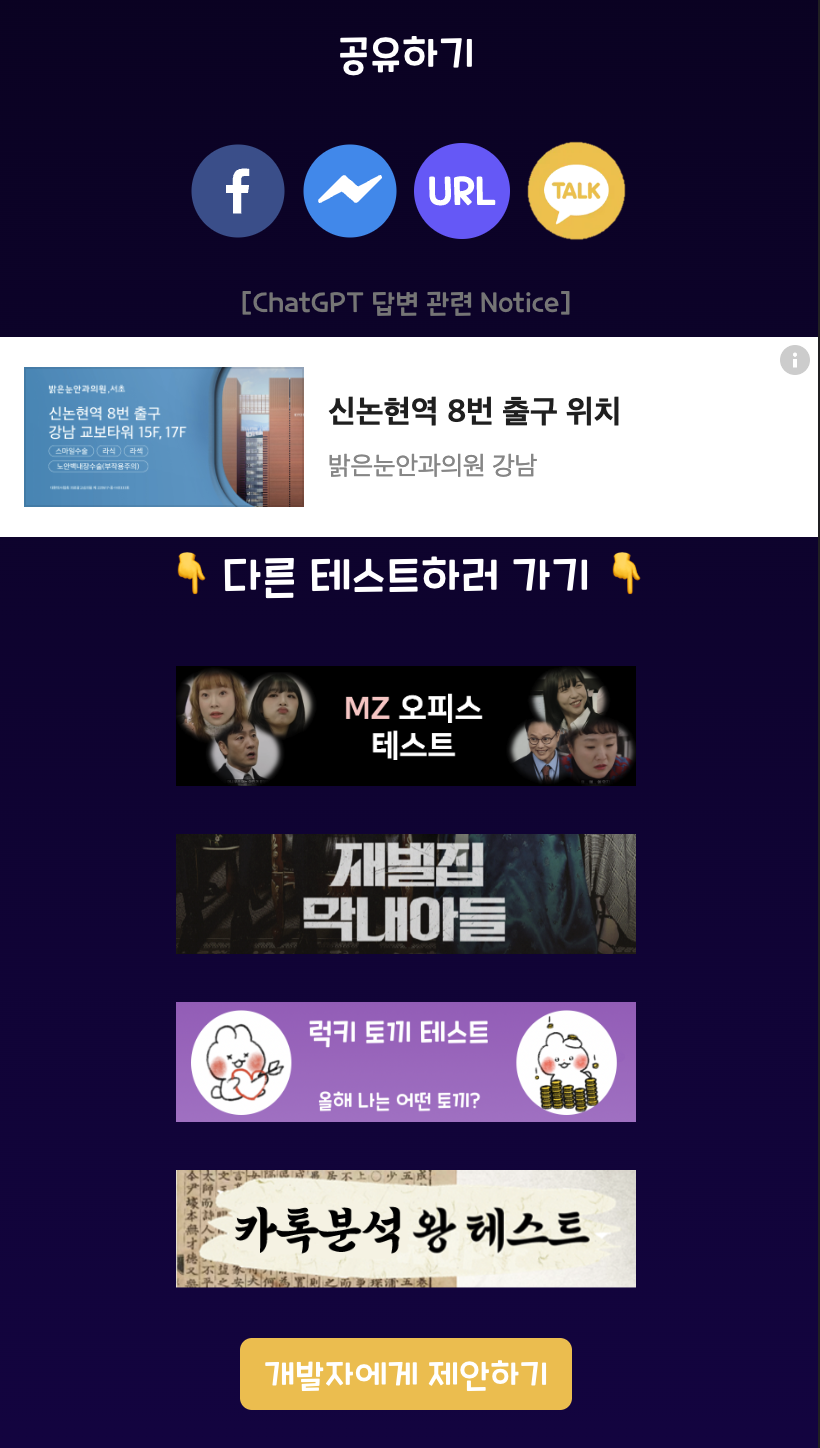 위의 그림 7과 같이, 하단에 '공유하기' 버튼 그룹에는 좌측부터 차례대로 페이스북, 페이스북 메시지, URL복사, 카카오톡 링크 공유하기 버튼을 배치하였습니다. 공유하기 버튼 그룹 하단에는 다른 테스트도 체험해 볼 수 있도록 배너링크를 추가하였습니다. 해당 서비스 이름을 클릭하시면 회원가입 없이 무료로 체험할 수 있습니다. 마지막으로, '개발자에게 제안하기' 버튼 클릭 시 카카오 플러스 친구를 통해 소통할 수 있는 창구를 만들었습니다.