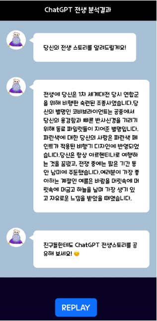 위의 그림 6은 결과 페이지입니다. 중간에 사용자 답변 내용을 고려하여 ChatGPT가 분석한 전생 스토리를 제공합니다.
