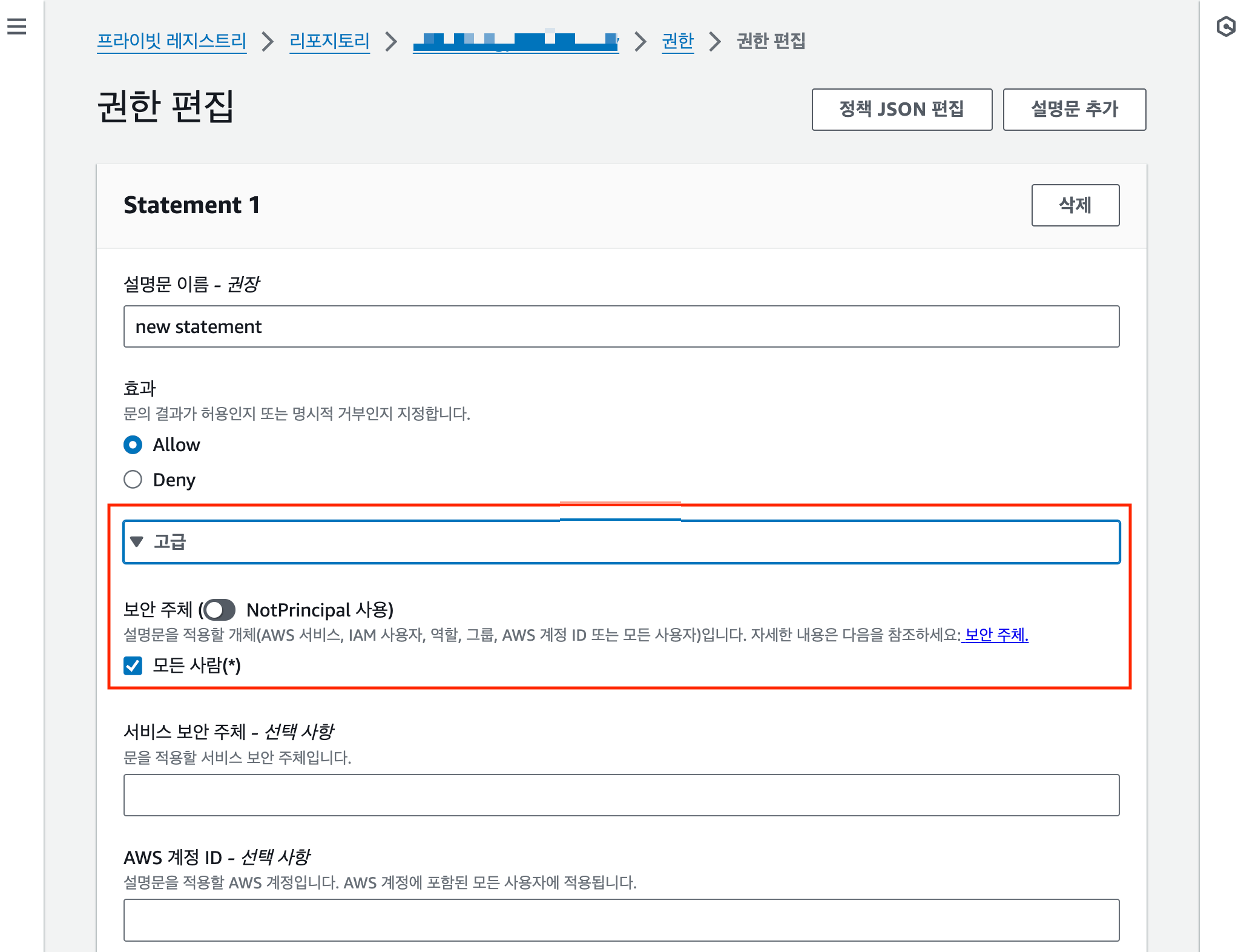 ํ๋จ ๊ทธ๋ฆผ 4์ ๊ฐ์ด '๊ณ ๊ธ' ํด๋ฆญ ํ '๋ชจ๋ ์ฌ๋(*)'์ ์ฒดํฌํฉ๋๋ค (์๋ฌธ : principal:*).