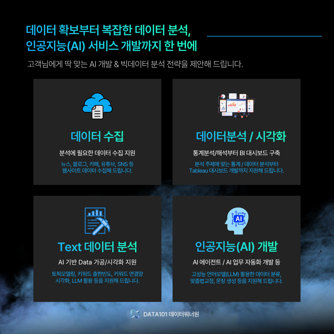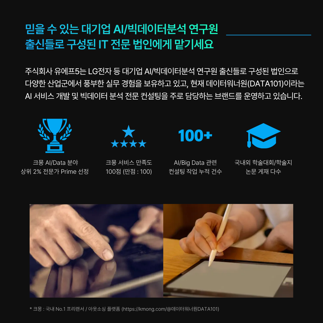 μ•ˆλ…•ν•˜μ„Έμš”, AI/빅데이터뢄석 μ—°κ΅¬κ°œλ°œ 전문법인 DATA101 νŒ€μž…λ‹ˆλ‹€.
