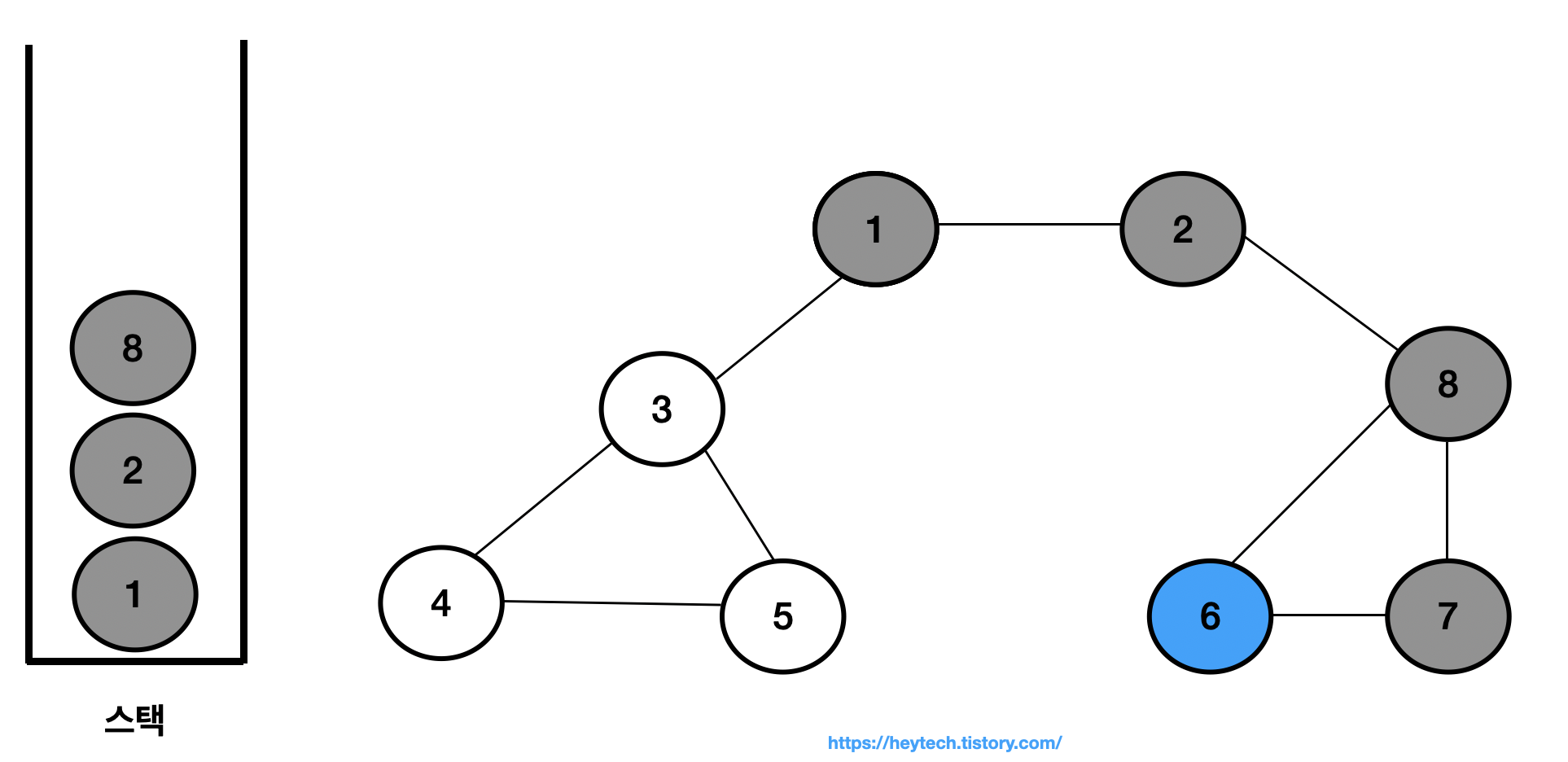 (4) 스택 내 최상단 노드인 노드 8에 인접한 노드는 6과 7이 있으며, 번호가 낮은 노드 6을 스택에 삽입하고 방문 처리합니다.
