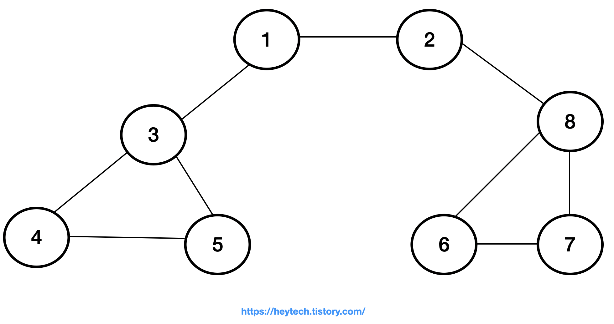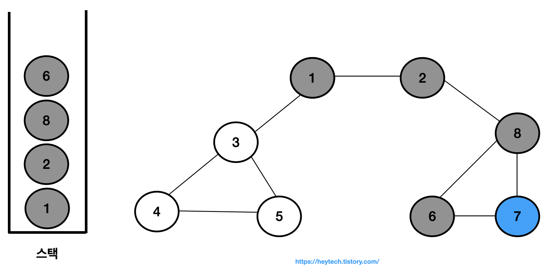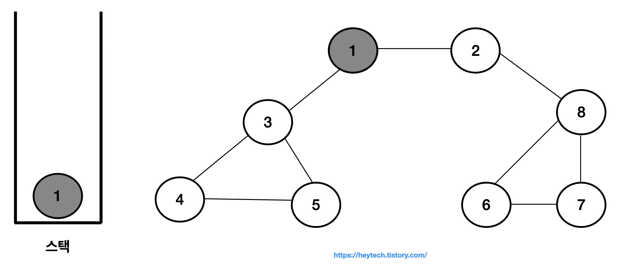 이제 아래 그림 1 과 같은 그래프 예시를 통해 DFS 동작 과정을 알아보겠습니다. 노드 1을 시작 노드로 설정하겠습니다. 일반적으로 인접한 노드가 2개 이상인 경우에는 해당 노드들 중 번호가 낮은 노드부터 처리합니다. 편의상 현재 처리 중인 스택 내 최상단 노드는 파란색으로,방문 처리한 노드는회색으로 표시하겠습니다.