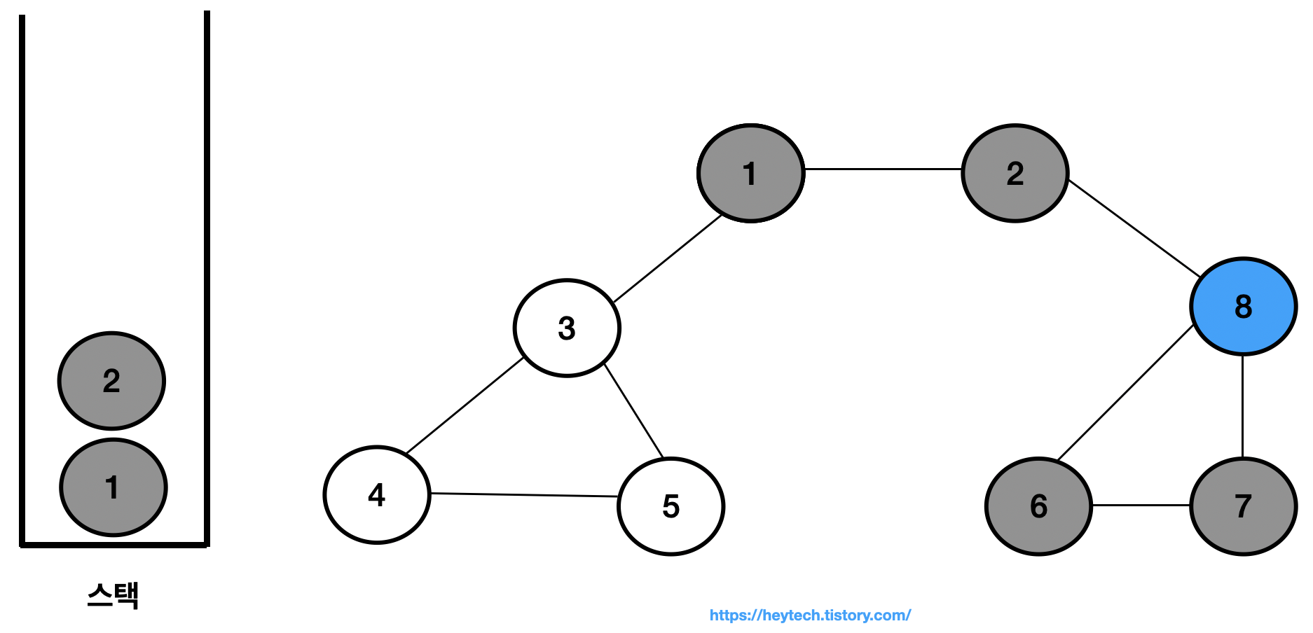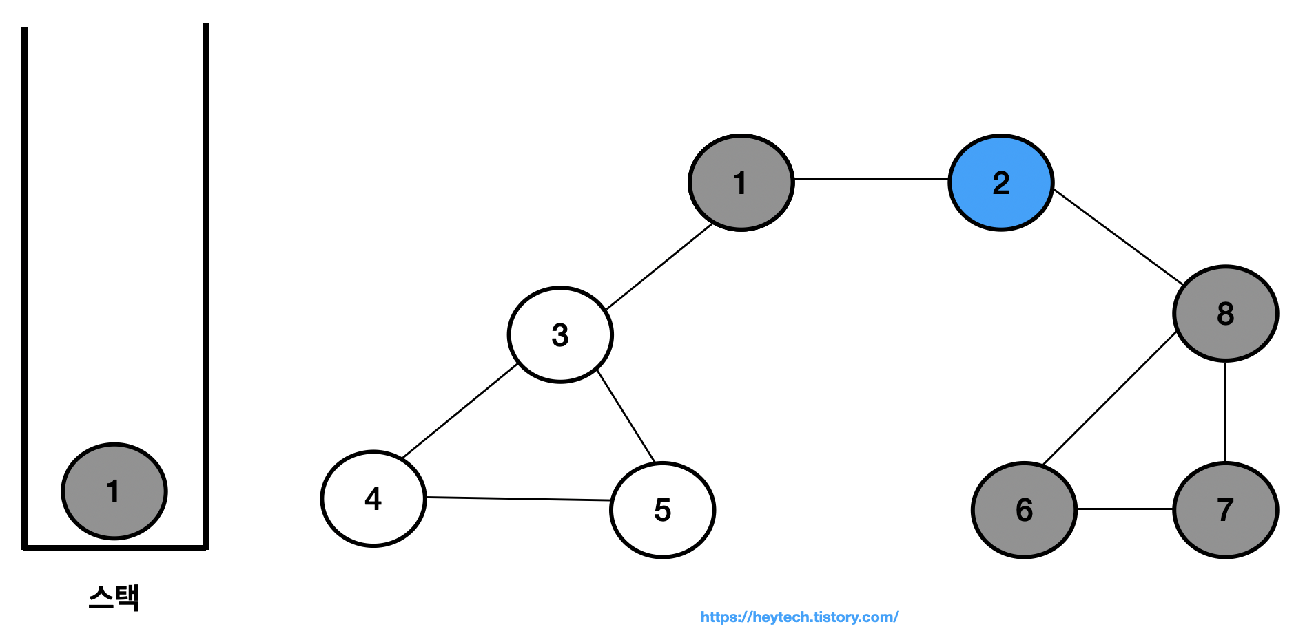 이제 아래 그림 1 과 같은 그래프 예시를 통해 DFS 동작 과정을 알아보겠습니다. 노드 1을 시작 노드로 설정하겠습니다. 일반적으로 인접한 노드가 2개 이상인 경우에는 해당 노드들 중 번호가 낮은 노드부터 처리합니다. 편의상 현재 처리 중인 스택 내 최상단 노드는 파란색으로,방문 처리한 노드는회색으로 표시하겠습니다.