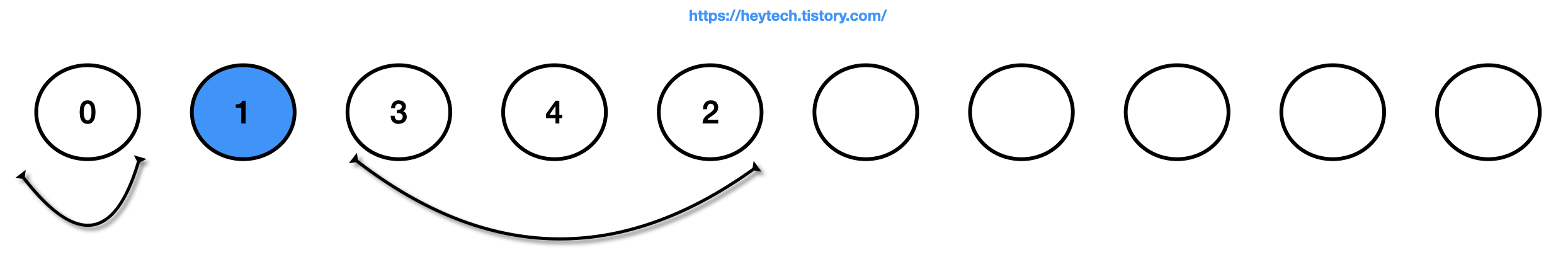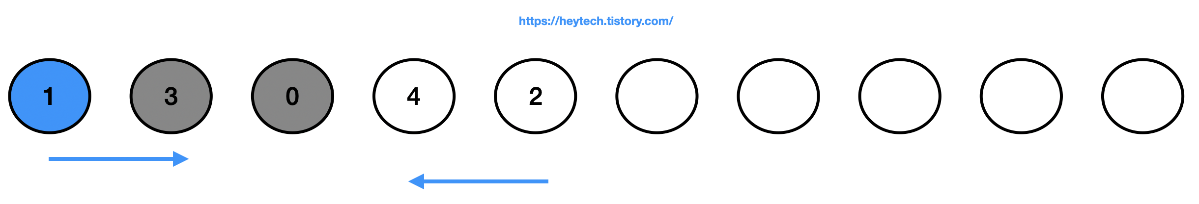 3) 데이터가 변경된 위치에서 다시 피벗을 기준으로 데이터를 찾습니다. 아래 그림과 같이, 좌측에서 우측 방향으로 찾은 데이터 3과 우측에서 좌측 방향으로 찾은 데이터 0 간의 위치가 서로 엇갈린 것을 확인하실 수 있습니다. 이럴 때는 피벗보다 작은 데이터와 피벗의 위치를 서로 변경해 줍니다. 즉, 피벗보다 작은 데이터 0과 피벗 1의 위치를 서로 변경하여 분할을 수행합니다.