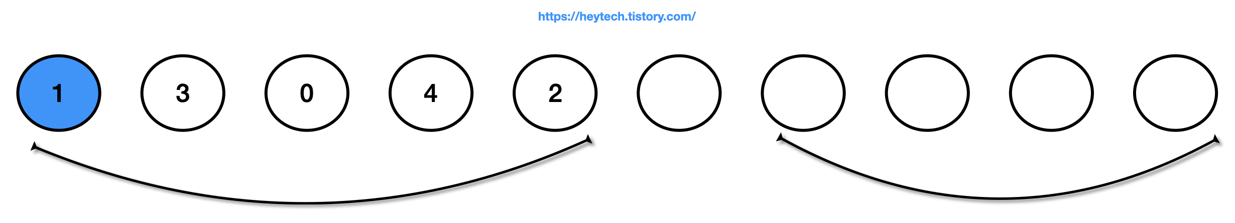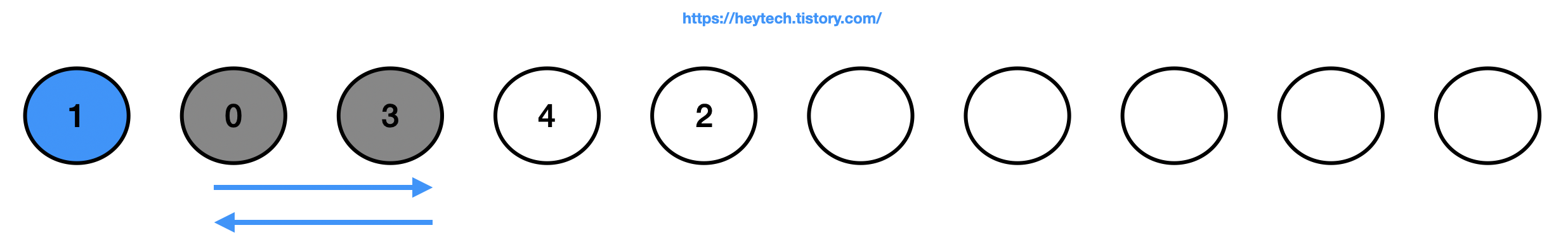 3) 데이터가 변경된 위치에서 다시 피벗을 기준으로 데이터를 찾습니다. 아래 그림과 같이, 좌측에서 우측 방향으로 찾은 데이터 3과 우측에서 좌측 방향으로 찾은 데이터 0 간의 위치가 서로 엇갈린 것을 확인하실 수 있습니다. 이럴 때는 피벗보다 작은 데이터와 피벗의 위치를 서로 변경해 줍니다. 즉, 피벗보다 작은 데이터 0과 피벗 1의 위치를 서로 변경하여 분할을 수행합니다.