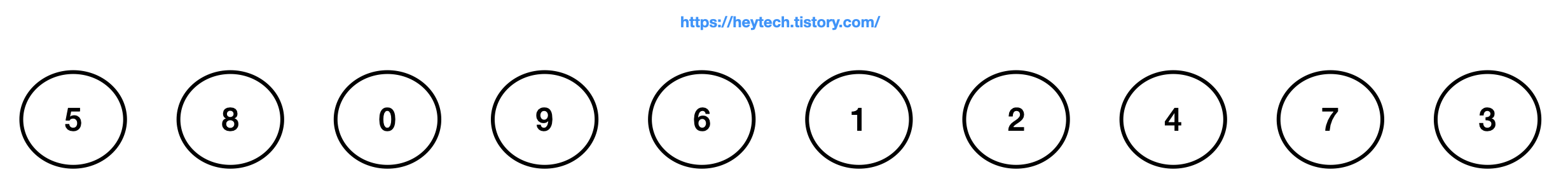 그림 1 과 같이 정수 10개가 무작위로 배치되어 있을 때 퀵 정렬을 활용해서 오름차순으로 정렬해 보도록 하겠습니다.