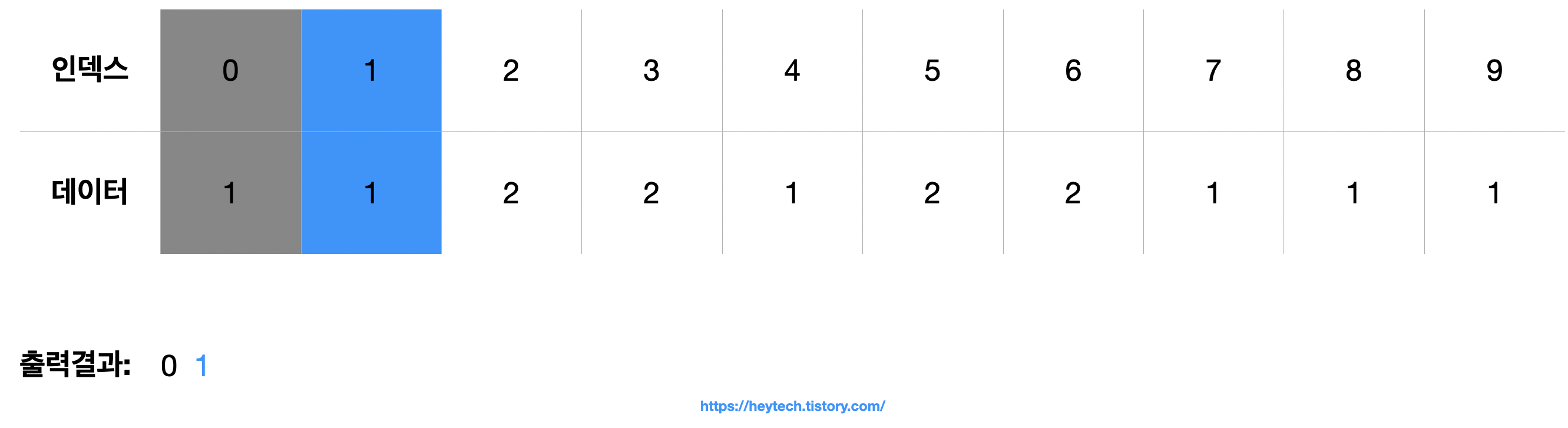 (2) 다음으로 인덱스 1의 데이터 값이 1이므로 1을 1번만 출력합니다.