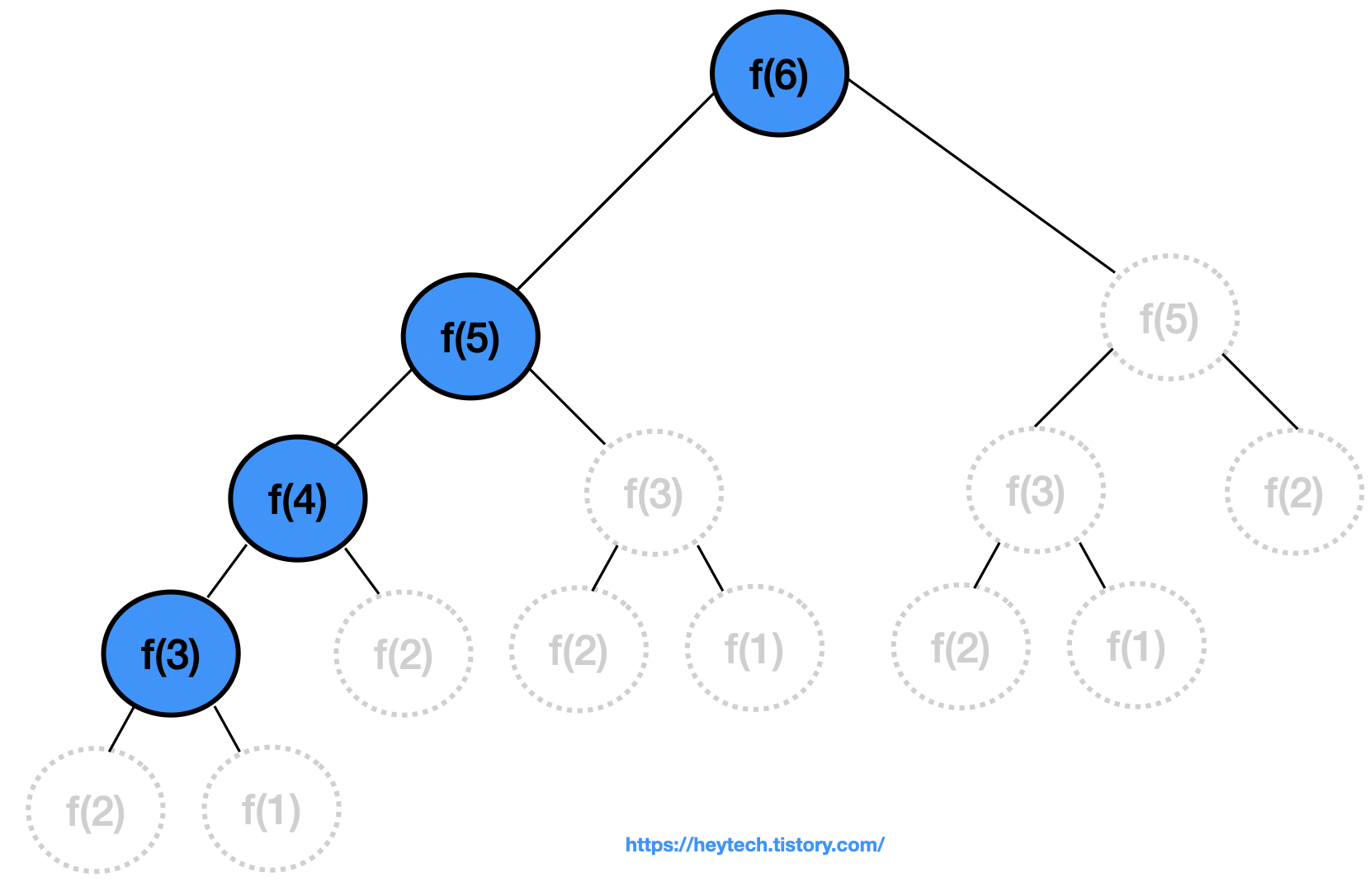 메모이제이션 기법을 활용하면 파란색 노드만 연산해 주면 되기 때문에 연산의 효율을 극대화할 수 있습니다. 회색 노드는 사실상 방문하지 않아도 됩니다. 왜냐하면 이미 계산된 결괏값이 리스트에 저장되어 있거나 1을 반환(i.e., \(f(1)\) 또는 \(f(2)\))하면 되기 때문입니다.