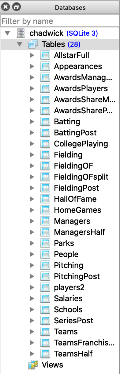 위의 스크린샷 속 데이터베이스는 앞으로 다루게 될 오픈소스 데이터베이스로서 미국 최대 야구리그인 메이저리그(MLB) 내 선수 정보를 담은 데이터베이스입니다.
