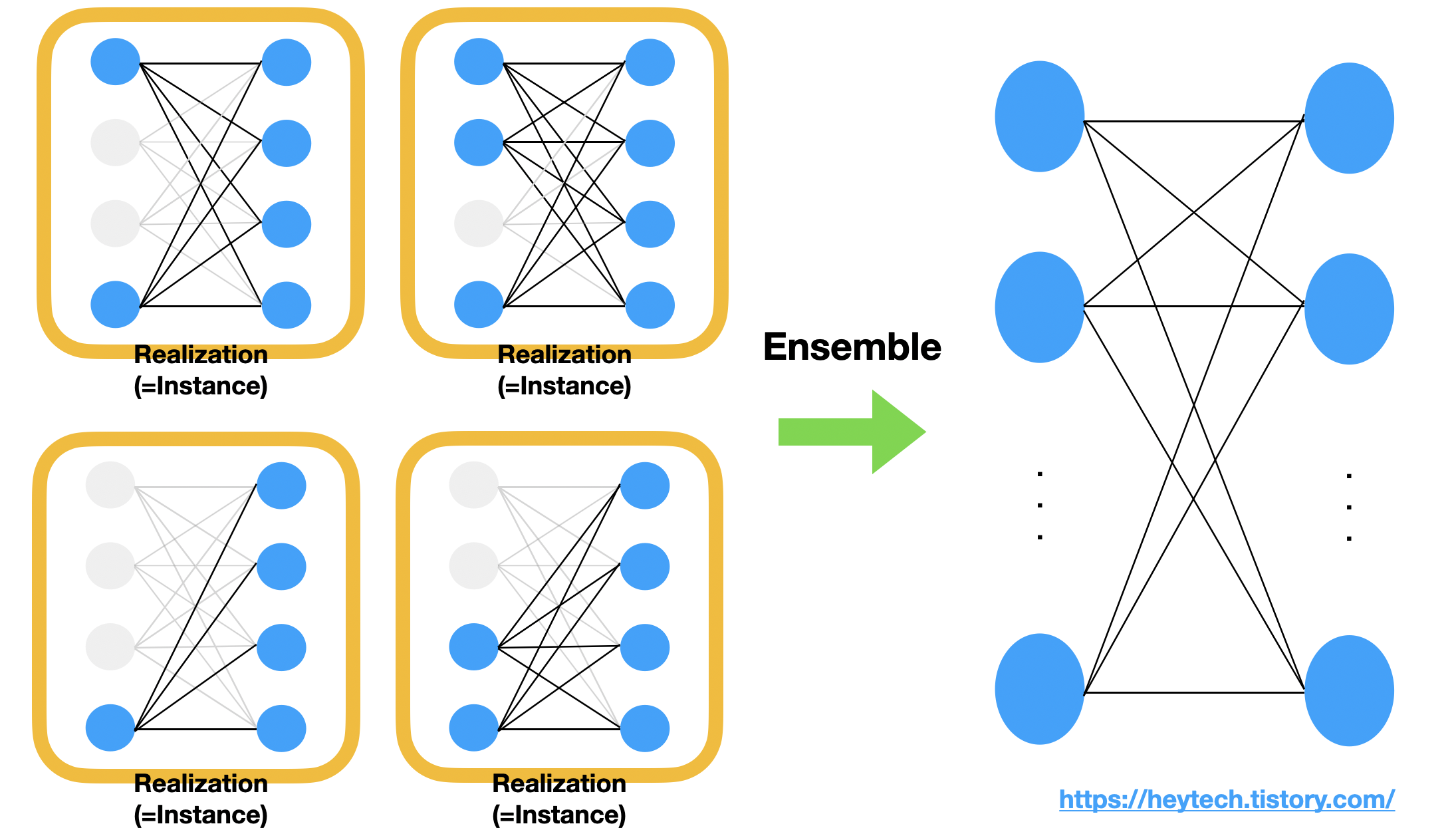 그 이유에 대해 천천히 알아보겠습니다. 위의 그림 2 에서 노란색 박스 안에 있는 Drop-Out이 적용된 전결합계층은 하나의 Realization 또는 Instance라고 부릅니다. 각 realization이 일부 뉴런만으로도 좋은 출력값을 제공할 수 있도록 최적화되었다고 가정했을 때, 모든 realization 각각의 출력값에 평균을 취하면(=ensemble) 그림 2의 화살표 우측 과 같이 모든 뉴런을 사용한 전결합계층의 출력값을 얻을 수 있습니다. 특히 이 출력값은 Drop-out을 적용하기 전과 비교했을 때, 더욱 편향되지 않은 출력값을 얻는 데 효과적입니다.
