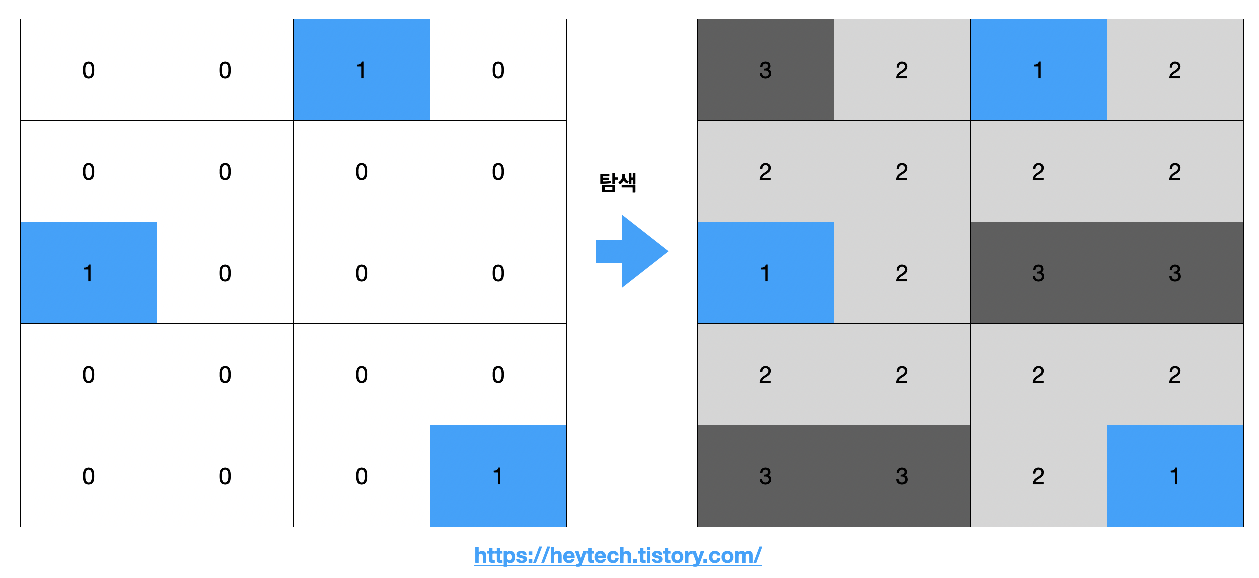 - 새로운 좌표의 거릿값은 출발 노드의 거릿값에 1을 더한 값을 할당합니다.