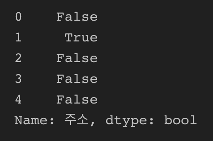 위의 데이터프레임 예시처럼 주소 정보가 주어질 때, 특정 구나 동에 거주하는 사람들만 조회하고 싶다면 어떻게 해야 할까요? 이럴 때 사용하는것이 데이터프레임의 내장 함수인 str.contains()입니다. 사용방법을 예시와 함께 살펴보죠.