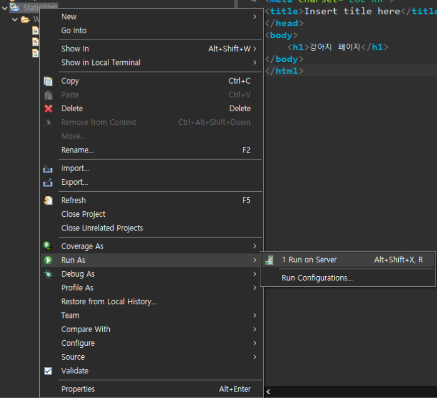 ์น ์๋ฒ๋ฅผ ๊ตฌ๋ํฉ๋๋ค. ํ๋ก์ ํธ ํด๋๋ฅผ ๋ง์ฐ์ค ์ฐํด๋ฆญ > Run As > Run on Server๋ฅผ ์ฐจ๋ก๋ก ํด๋ฆญํฉ๋๋ค.