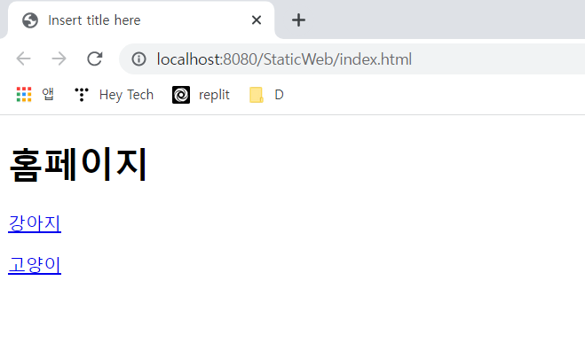 ์๋์ ๊ฐ์ด ํฌ๋กฌ ๋ธ๋ผ์ฐ์ ์์ ๊ฒฐ๊ณผ๊ฐ ์ถ๋ ฅ๋๋ ๊ฒ์ ํ์ธํ ์ ์์ต๋๋ค. "๊ฐ์์ง" ๋๋ "๊ณ ์์ด" ํ ์คํธ๋ฅผ ํด๋ฆญํ๋ฉด ๊ฐ๊ฐ ํด๋น html ํ์ผ๋ก ์ด๋ํฉ๋๋ค.