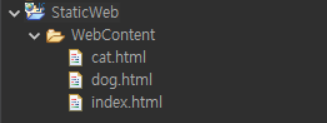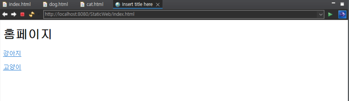index ํ์ด์ง์์ ํ์ดํผ๋งํฌ๋ฅผ ํตํด dog์ cat ํ์ด์ง๋ก ๊ฐ๊ฐ ์ด๋ํ ์ ์๋๋ก ์ค์ ํด ์ค๋๋ค.