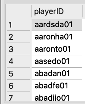아래와 같이 People이라는 테이블에 playerID 칼럼에는 MLB 선수들의 ID가 담겨있습니다.