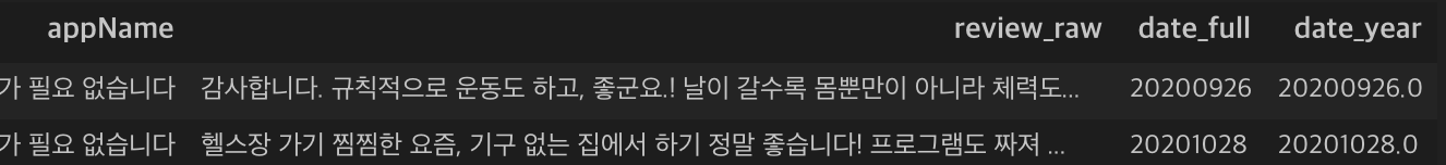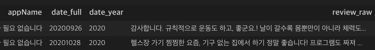 아래 예시 데이터셋에서는 appName, review_raw, date_full, date_year 칼럼 순서입니다.