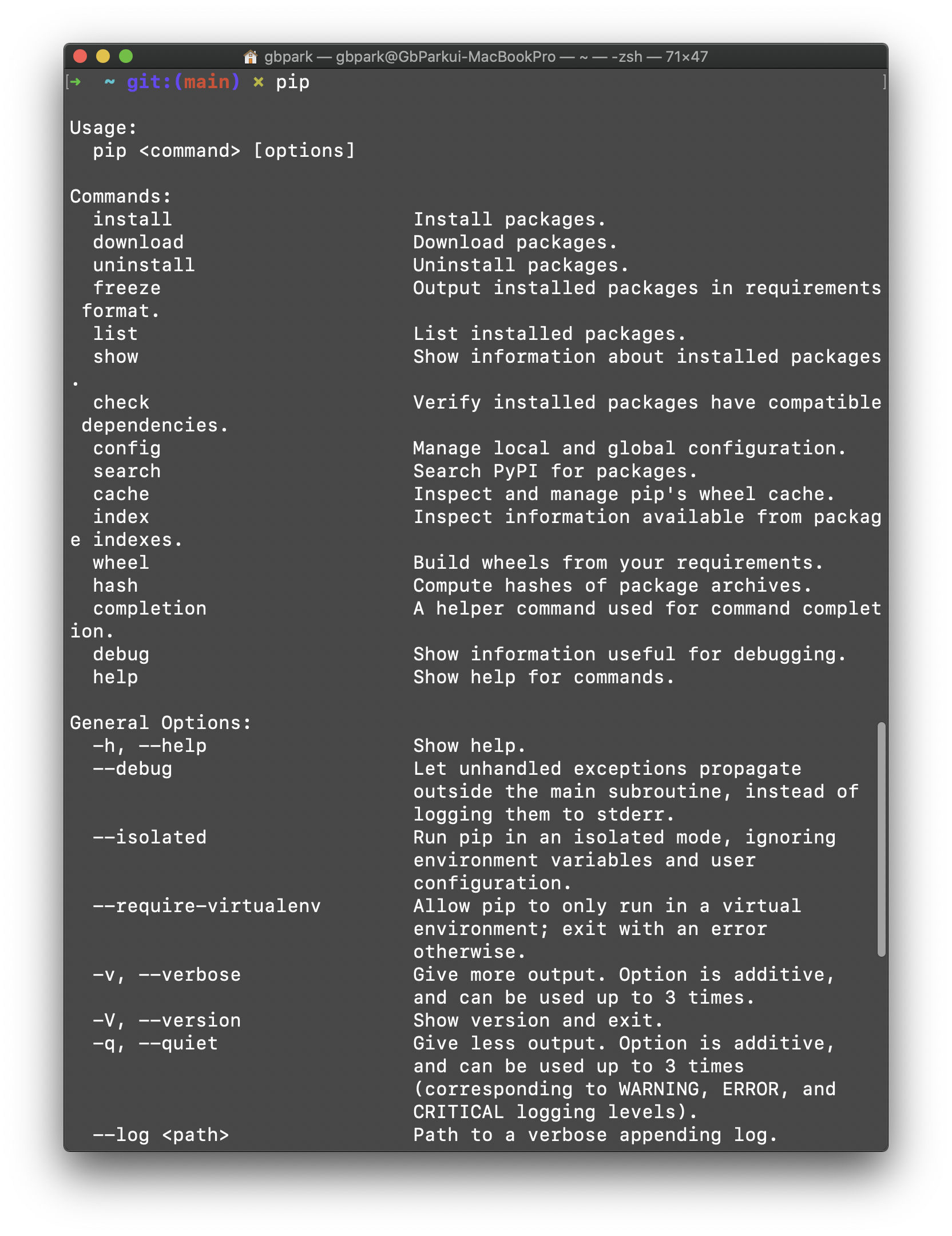 Python 2 버전을 사용하고 계시면 터미널에 pip를 입력해 봅니다.