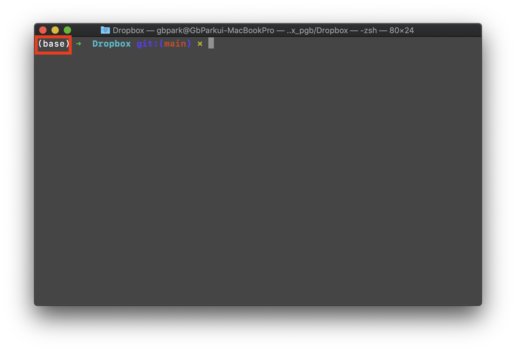 이제 새로운 터미널을 오픈하시면 (base) 문구가 출력되지 않는 것을 확인하실 수 있습니다.