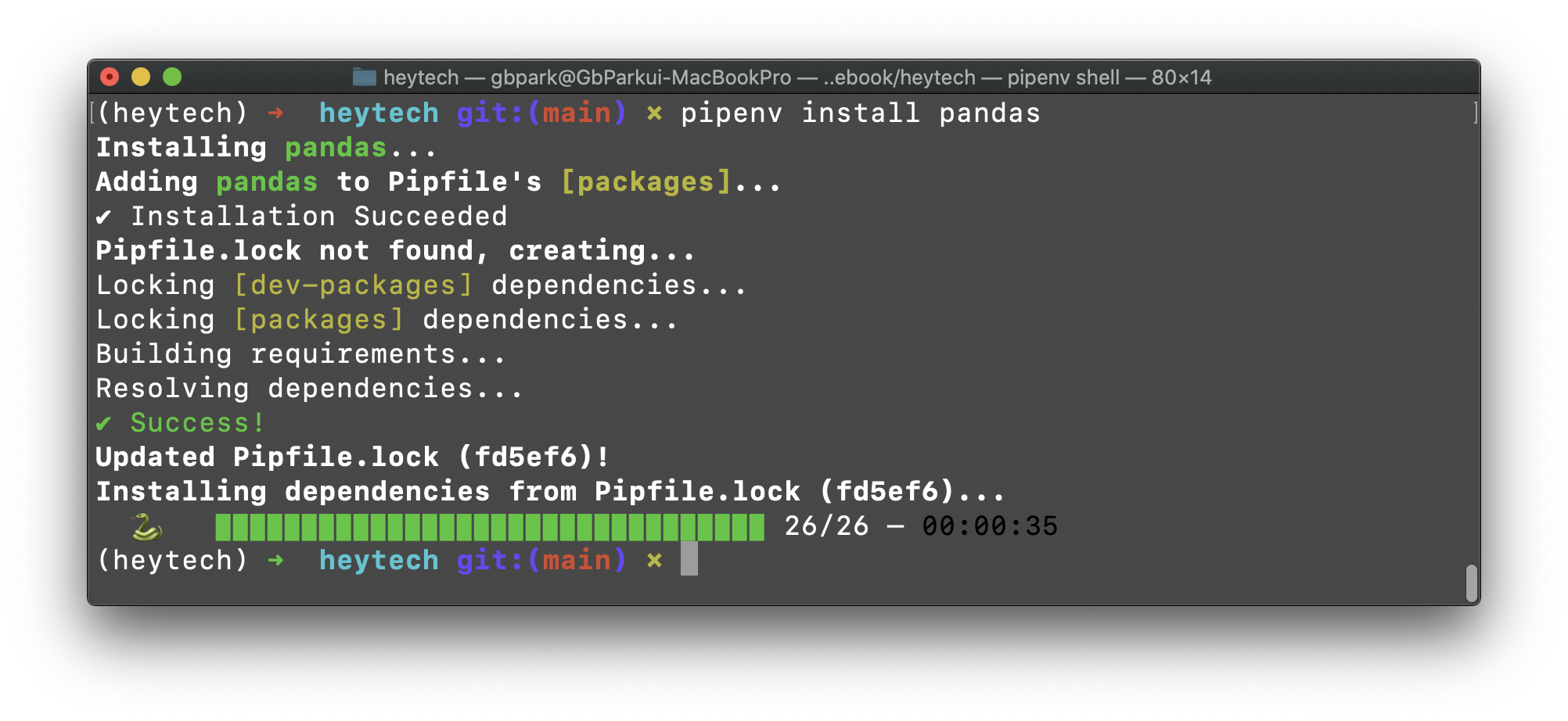 ์ผ๋ฐ์ ์ผ๋ก pipenv ํ๊ฒฝ์์๋ pipenv install ๋ช ๋ น์ด๋ก ํจํค์ง๋ฅผ ์ค์นํฉ๋๋ค.