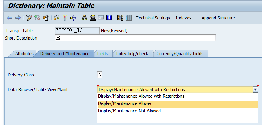 Data Browser/Table View Maint 탭은 유지보수의 허용여부를 설정하는 것으로써, 유지보수가 가능한 Display/Maintenance Allowed를 선택합니다.