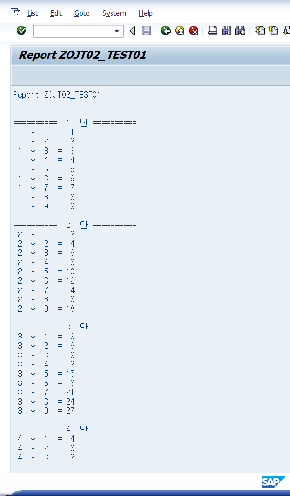 이제 앞서 테이블에 저장한 값을 LOOP~ENDLOOP 반복문을 활용하여 차례로 출력합니다. 구구단에서 뒤에 곱해지는 값(GT_A-STR2)이 1인 경우(e.g., 1*1, 2*1, ..., 9*1)에는 IF 조건문을 활용하여 현재 단 정보를 출력하도록 작성하였습니다. 뒤에 곱해지는 값이 1이 아닌 경우에는 "GT_A-STR1*GT_A-STR2=GT_A-VAL" 형태로 출력되도록 프로그램을 작성하였습니다.