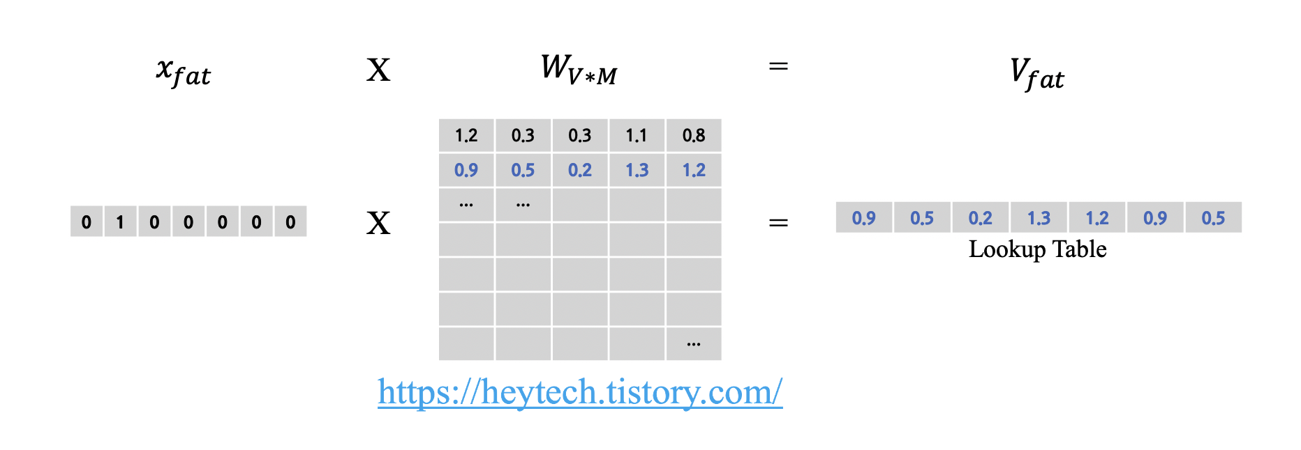 룩업 테이블(Lookup Table)에 대해 알아봅니다. 단어 집합에서 \(i\)번째 단어의 원-핫 벡터에는 \(i\) 인덱스의 값만 \(1\)이고 나머지는 모두 \(0\)입니다. 즉, \(i\)번째의 단어 벡터와 가중치 행렬의 곱셈 결과는 사실상 가중치 행렬의 인덱스 \(i\) 행(row)을 그대로 읽어오는 것(=lookup)과 같습니다. 예를 들어보죠. 주변 단어의 원-핫 벡터를 \(x\)라고 하겠습니다. 아래 그림 5와 같이 'fat'이라는 단어의 인덱스는 [1]이므로 원-핫 벡터에 인덱스 [1] 값만 \(1\)이죠. 이 벡터를 가중치 행렬과 곱하면, 결괏값은 가중치 행렬에 인덱스 [1] 행을 그대로 가져온 것과 같습니다. 이러한 작업을 룩업 테이블이라고 부릅니다. 여기서 알 수 있는 것은 입력 벡터의 워드 임베딩(Word Embedding) 후 크기는 투사층의 크기 \(M\)과 같다는 점입니다.