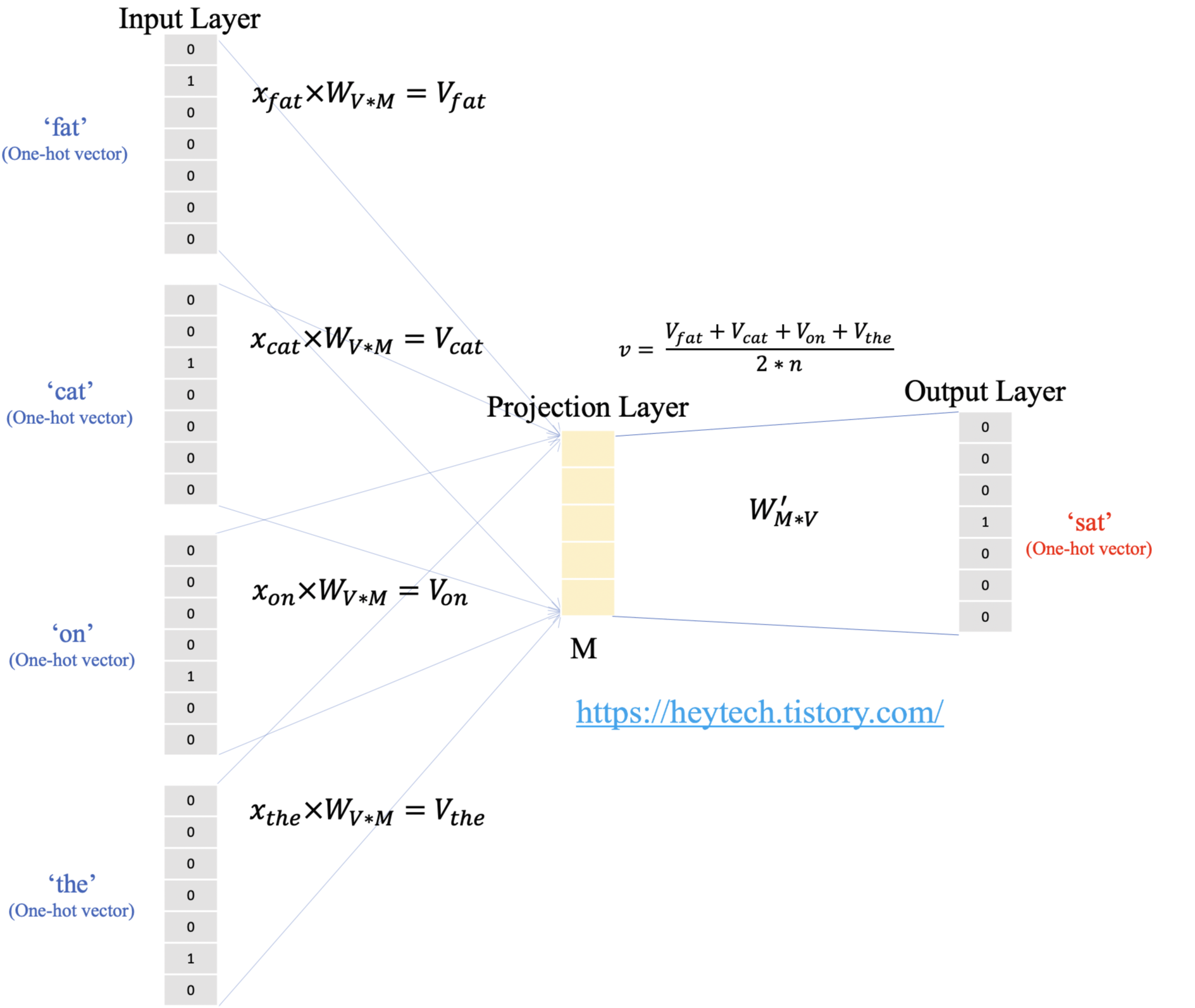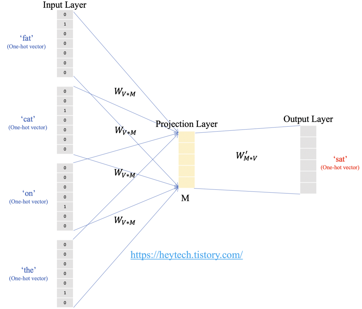 CBOW의 인공신경망(Artificial Neural Network, ANN)을 도식화하면 위의 그림 3과 같습니다. 입력층(input layer)에는 사용자가 지정한 윈도우 크기 범위 내 주변 단어들의 원-핫 벡터가 입력으로 들어갑니다. 입력값이 투사층(projection layer)을 통과하면 출력층(output layer)에서 중간 단어를 예측한 벡터가 출력됩니다.