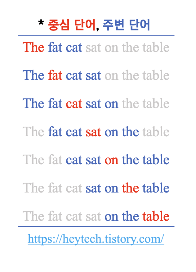 즉, 단어를 예측 및 학습할 때 고려하는 문맥은 오직 1개뿐입니다. 아래의 표와 같이 말이죠. 예를 들어, 'sat'이라는 단어를 예측할 때는 'fat', 'cat', 'on', 'the'라는 주변 단어를 활용한 게 전부입니다.