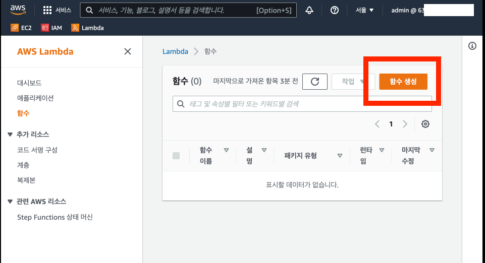 AWS ์น ์ฌ์ดํธ์์ Lambda๋ฅผ ๊ฒ์ํ์ฌ Lambda ์ฝ์์ ์ ๊ทผํฉ๋๋ค(๊ทธ๋ฆผ 3).