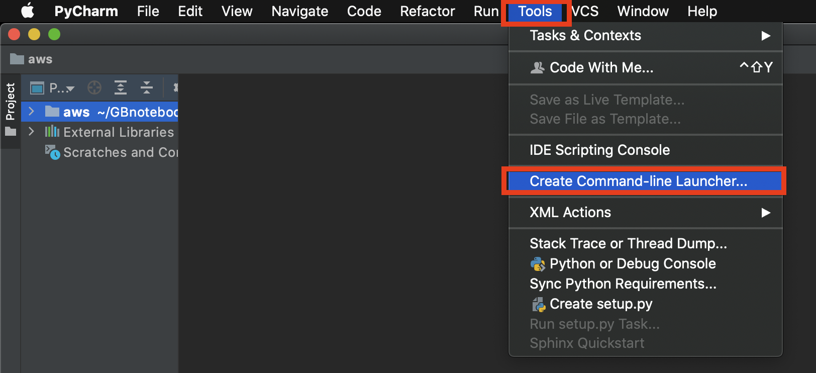 PyCharm IDE๋ฅผ ์ง์ ์ฌ์ ํ, ์๋์ ๊ทธ๋ฆผ 2์ ๊ฐ์ด ์๋จ ๋ฉ๋ด๋ฐ-Tools-Create Command-line Launcher๋ฅผ ํด๋ฆญํฉ๋๋ค.
