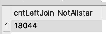 올스타에 선정된 적이 없는 선수를 출력하기 위해서는 Q1에서 t1과 t2를 t1을 기준으로 LEFT JOIN 한 것에서 t1과 t2 간의 교집합을 제외해야 합니다. 즉, 차집합(t1 - t2)을 구하면 됩니다. 아래와 같이 18,044명의 선수는 1번이라도 올스타에 선정된 적이 없는 것을 알 수 있습니다.