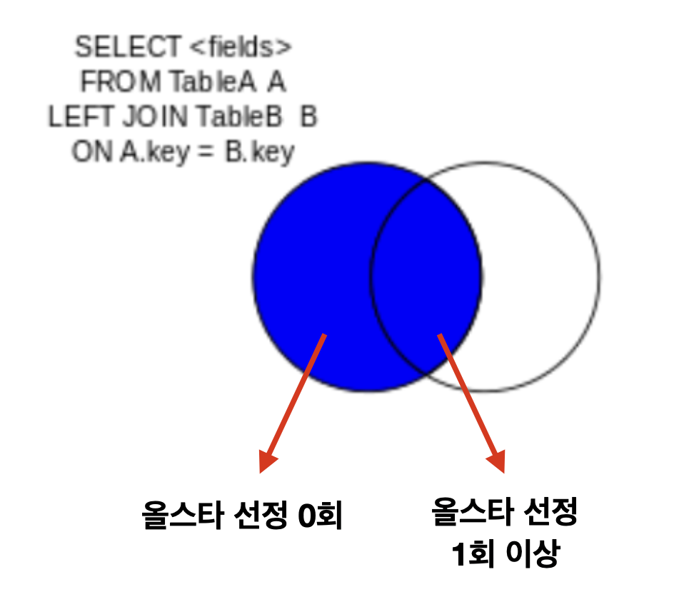 즉, 올스타에 1번도 선정되지 않은 선수(교집합을 제외한 t1)와 올스타에 1번 이상 선정된 선수(두 테이블의 교집합)의 올스타 선정 횟수를 출력한 셈입니다.