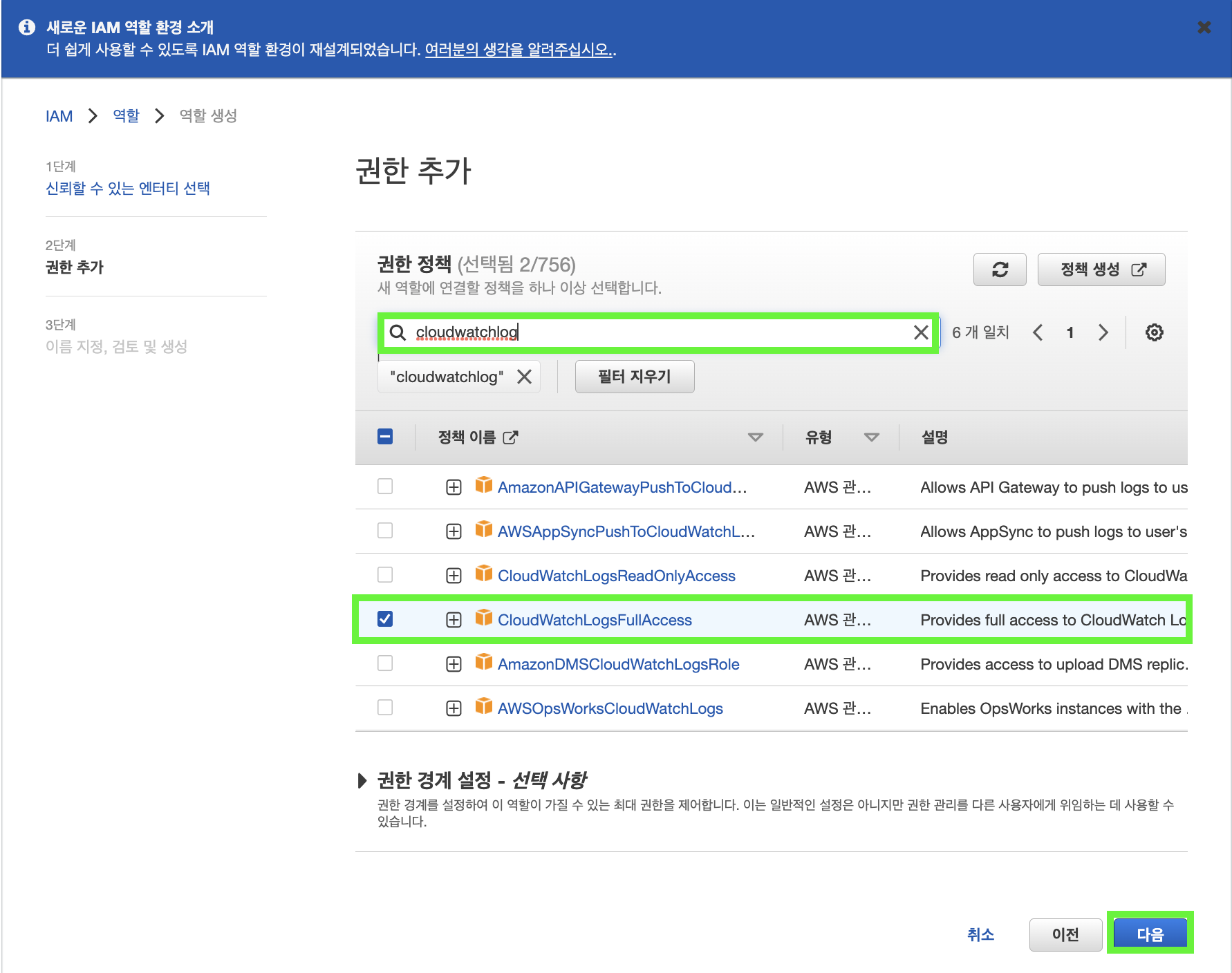 ๋ง์ฐฌ๊ฐ์ง๋ก, ๊ถํ ์ ์ฑ ๊ฒ์์ฐฝ์ cloudwatchlog๋ฅผ ์ ๋ ฅํ๊ณ , ํ๋จ์ CloudWatchLogFullAccess๋ฅผ ์ฒดํฌํฉ๋๋ค(๊ทธ๋ฆผ 7). ์ด์ ๋งจ ํ๋จ์ "๋ค์" ๋ฒํผ์ ํด๋ฆญํฉ๋๋ค.