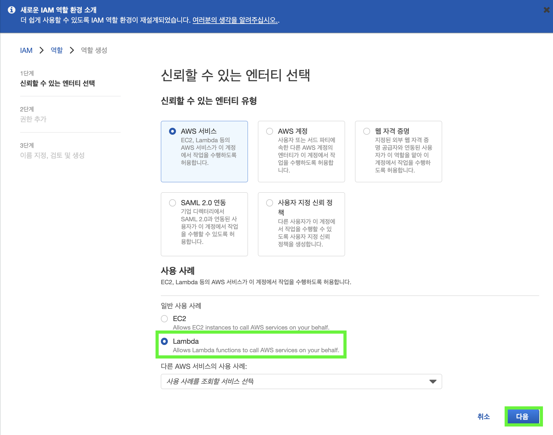 ์๋์ ๊ทธ๋ฆผ 5์ฒ๋ผ, ์ฌ์ฉ ์ฌ๋ก๋ Lambda๋ฅผ ์ฌ์ฉํ ์์ ์ด๋ฏ๋ก Lambda๋ฅผ ์ ํํ ํ, ํ๋จ์ "๋ค์" ๋ฒํผ์ ํด๋ฆญํฉ๋๋ค. AWS Lambda ๊ฐ๋ ์ ๋ํ ์์ธํ ์๊ฐ๋ ์ด๊ณณ์ ์ฐธ๊ณ ํด ์ฃผ์ธ์.