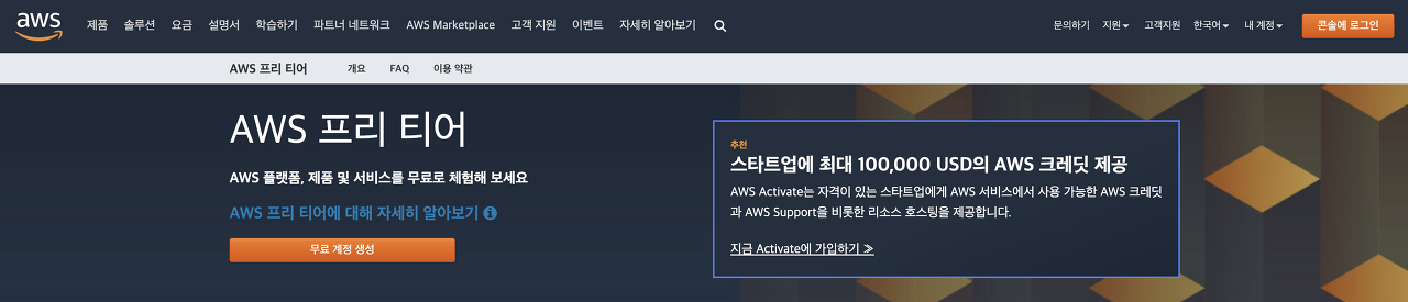 ๋จผ์ AWS ํํ์ด์ง์ ๋ฐฉ๋ฌธํ์ ์ ํ์๊ฐ์ ์ ํ์ ์ผ ํฉ๋๋ค. ์๋์ ์คํฌ๋ฆฐ์ท๊ณผ ๊ฐ์ด ์ต์ด ๊ฐ์ ํ ์ด๋ฉ์ผ ๊ณ์ ์ผ๋ก 1๋ ๊ฐ ๋ฌด๋ฃ ์ฒดํํ(a.k.a., ํ๋ฆฌ ํฐ์ด)์ ์ ๊ณตํฉ๋๋ค. ๋ฌผ๋ก ๋ฌด๋ฃ์ธ ๋งํผ ์ ์ฌ์ ์๋น์ค ๋ฌด๋ฃ๋ก ์ฌ์ฉ ๊ฐ๋ฅํฉ๋๋ค. ํ์๊ฐ์ ์ ํด์ธ ๊ฒฐ์ ๊ฐ ๊ฐ๋ฅํ ์ ์ฉ์นด๋ ๋ฑ๋ก์ด ํ์์ ๋๋ค. ์ ํจํ ์ ์ฉ์นด๋์ธ์ง 100์์ ๊ฒฐ์ ํ๋ค๊ฐ ๊ณง๋ฐ๋ก ์น์ธ ์ทจ์๋๋ ์ ํจํ ์ ์ฉ์นด๋๋ฅผ ์ค๋นํด ์ฃผ์ธ์.
