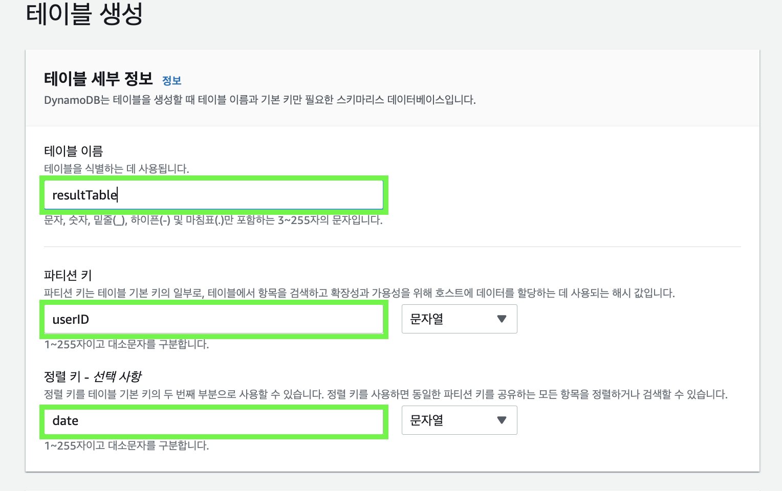 3) AWS DynamoDB ๊ฐ๋ ๋ฐ ํ ์ด๋ธ ์์ฑ ์ ์ฐจ(ํํฐ์ ํค, ์ ๋ ฌ ํค ๊ฐ๋ )