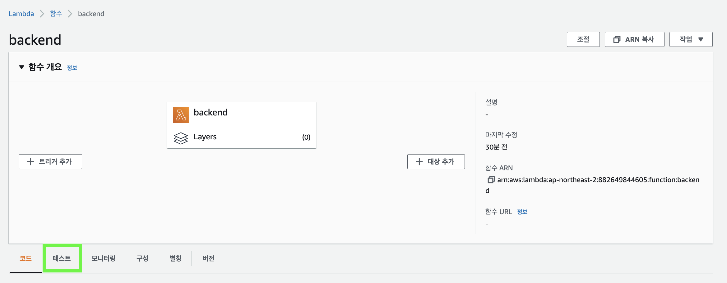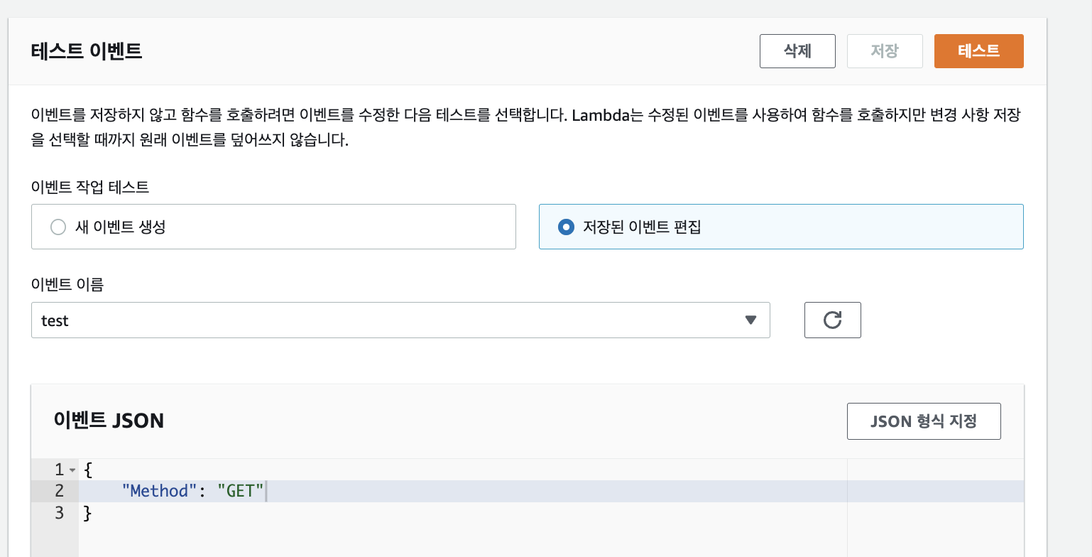 ๊ฐ๋จํ ํ ์คํธ๋ฅผ ์ํด Lambda ์ฝ์์์ ์๋์ ๊ทธ๋ฆผ 13์ฒ๋ผ, "ํ ์คํธ" ํญ์ผ๋ก ์ด๋ํฉ๋๋ค.