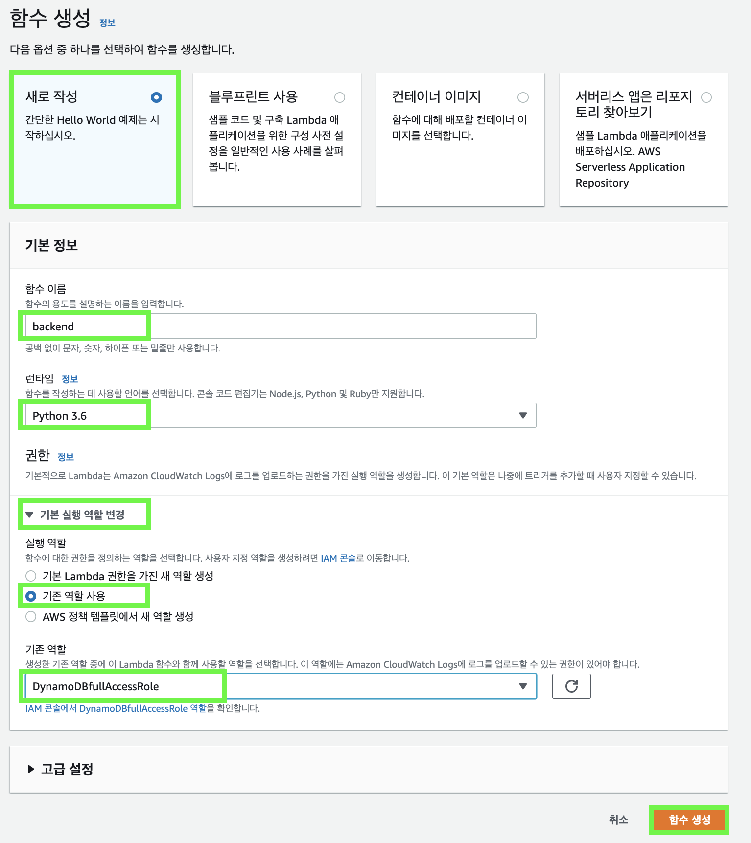 - ์คํ ์ญํ : "๊ธฐ์กด ์ญํ ์ฌ์ฉ" ์ ํ ํ ์์ ์์ฑํ IAM Role์ ์ ํ(DynamoDBfullAccess)