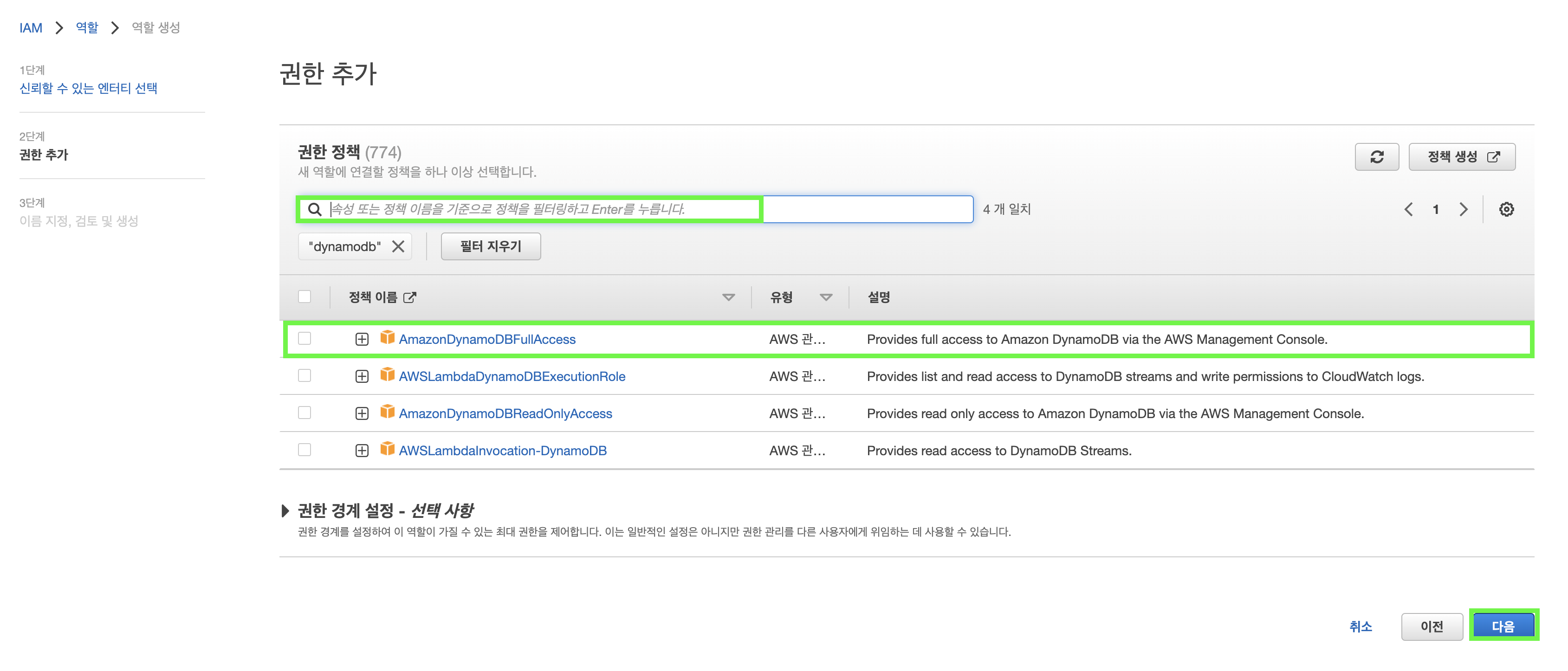 ์๋์ ๊ทธ๋ฆผ 8์ฒ๋ผ, ๊ฒ์์ฐฝ์ dynamodb๋ฅผ ์ ๋ ฅ ํ ์ํฐ๋ฅผ ์น์ ํ, ์๋์ AmazonDyanmoDBfullAccess ๊ถํ์ ์ฒดํฌํ์๊ณ ์๋์ "๋ค์" ๋ฒํผ์ ํด๋ฆญํฉ๋๋ค.