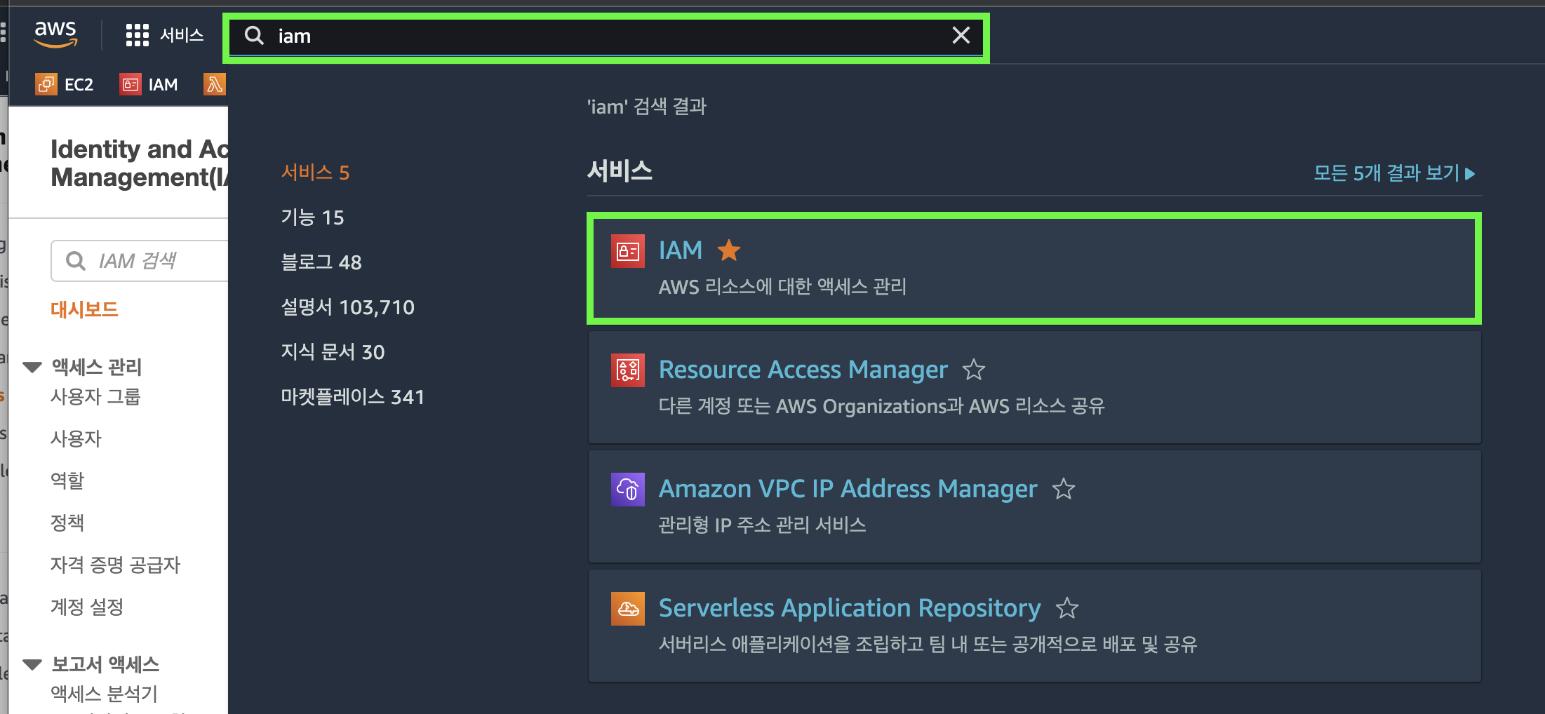 ๊ฒ์์ฐฝ์ IAM์ ๊ฒ์ํ์ ์ IAM ์ฝ์์ ์ ๊ทผํฉ๋๋ค(๊ทธ๋ฆผ 5).