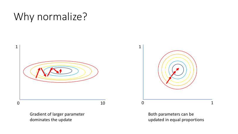 데이터를 정규화하게 되면 위의 문제점을 해결할 수 있습니다. 즉, 그림 1 우측처럼, 데이터 범위의 차이가 작아지기 때문에, 모델 학습 시 모든 Feature마다 파라미터가 유사한 중요도를 갖고 개선되기 때문에 최적화 과정이 개선되는 효과가 있습니다.