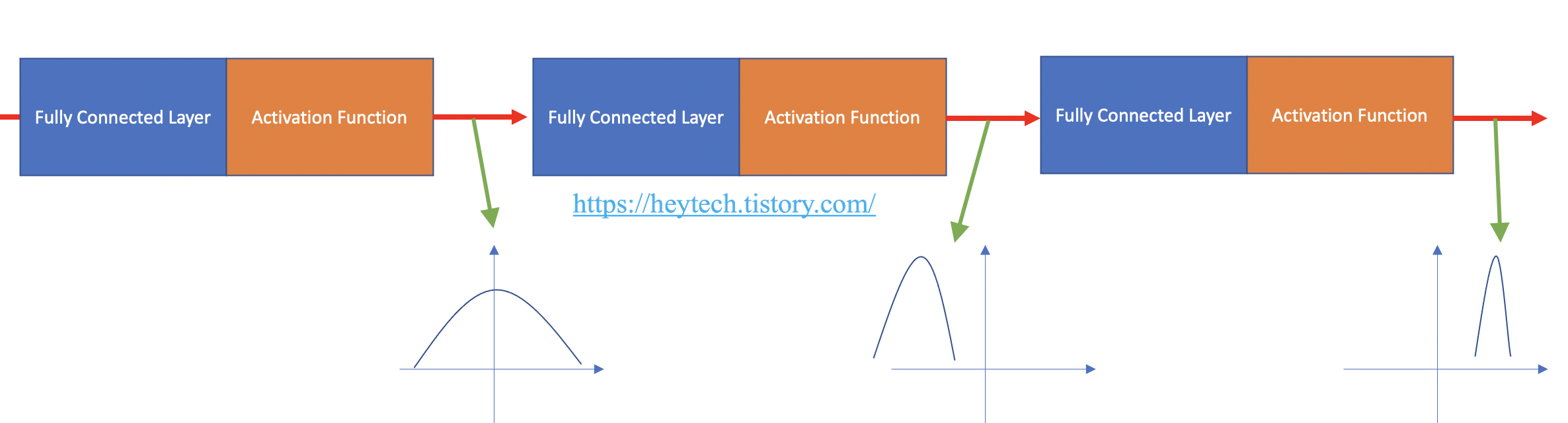 Internal Covariate Shift(ICS)는 모델이 학습 과정에서 Layer마다 입력 데이터의 분포가 변하는 현상입니다. 예를 들어, 아래의 그림 2처럼, 첫 번째 Layer를 통과한 후 출력이자 2번째 Layer의 입력 데이터의 분포는 Gausian 분포를 따르지만, 2번째 Layer의 출력과 3번째 Layer의 출력 데이터의 분포는 한쪽으로 치우치게 나타나는 경우입니다.