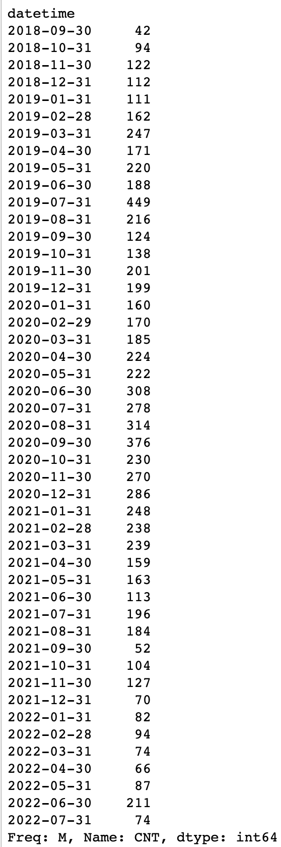 dataset_m = DATASET.resample('M')['CNT'].agg(np.sum).fillna(0)